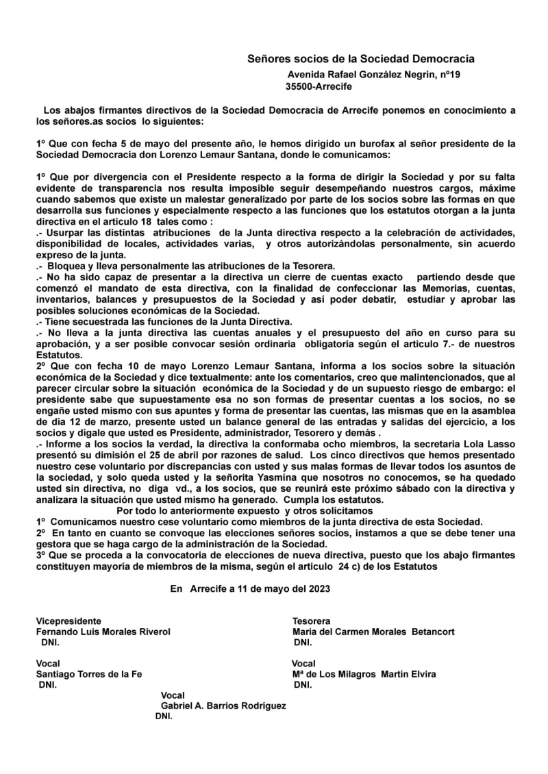 La práctica totalidad de la directiva de la Sociedad Democracia de Arrecife ha solicitado el cese del presidente, Lorenzo Lemaur, por su gestión al frente de la entidad. Además, los directivos firmantes del escrito solicitan la convocatoria de elecciones para elegir una nueva directiva.