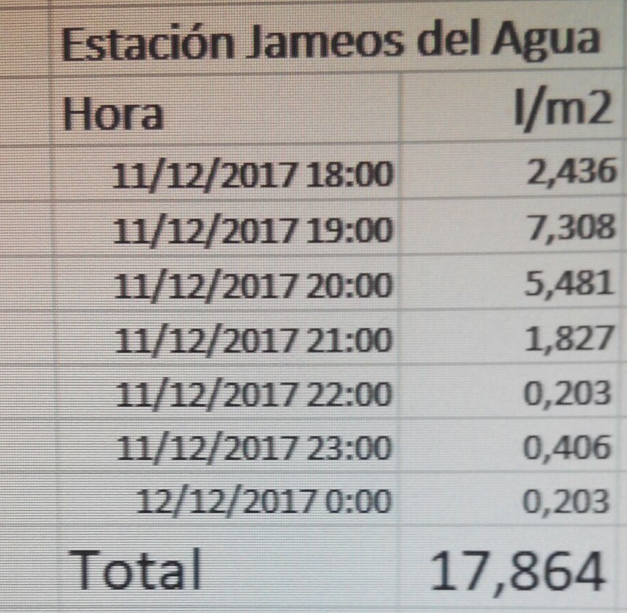 La mayor parte de las lluvias se registró a las 19.00 horas donde alcanzó los 7,31 litros y a las 20.00 horas, aunque un poco menos, llegó a los 5,48 litros, descendiendo hasta llegar a las 00.000 horas a los 0,20 litros.