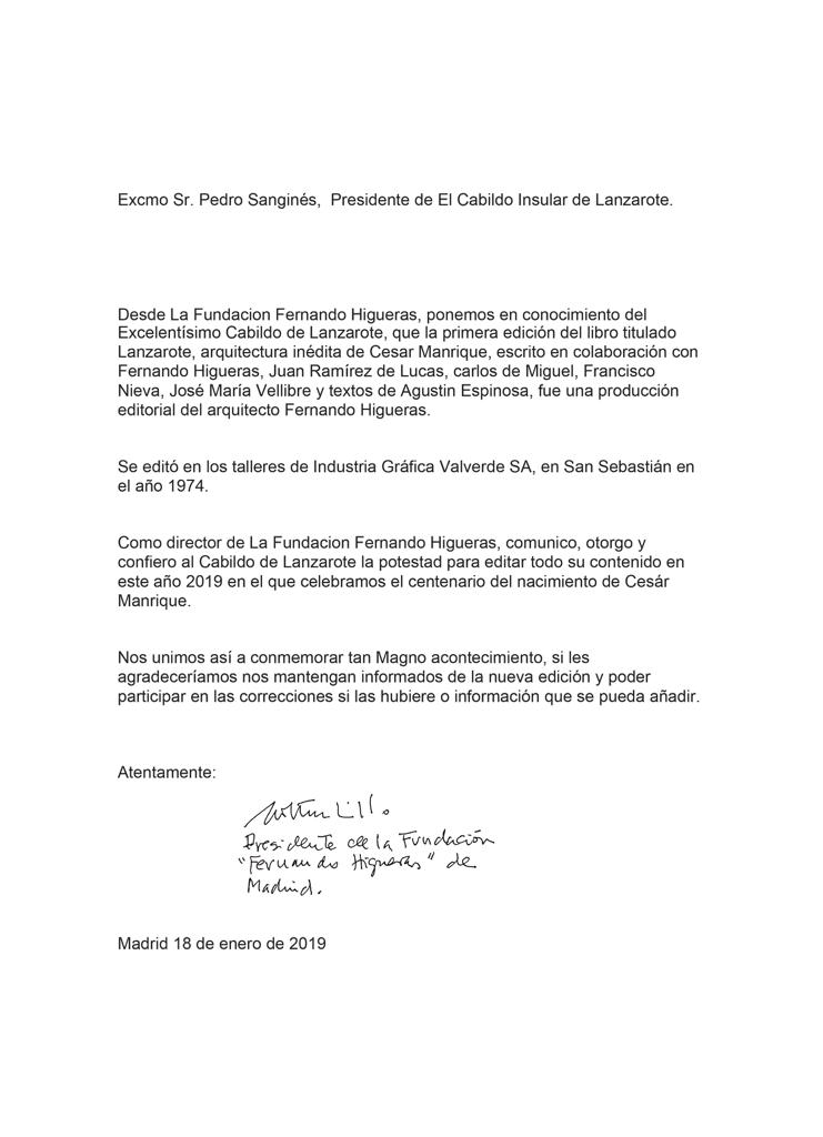 En este caso, la Fundación César Manrique remitió dos escritos, recibidos en la Presidencia del Cabildo con fecha 28 y 29 de mayo, en los que muestra su reiterada oposición a que el Cabildo reeditase esta tercera edición de la obra que fue publicada por primera vez en 1974, cuyo editor entonces fue el arquitecto y colaborador de Manrique, Fernando Higueras, quien financió la publicación y cuya Fundación, actualmente, dice ostentar (según escrito recibido y que se adjunta*) los derechos de edición de la citada obra.