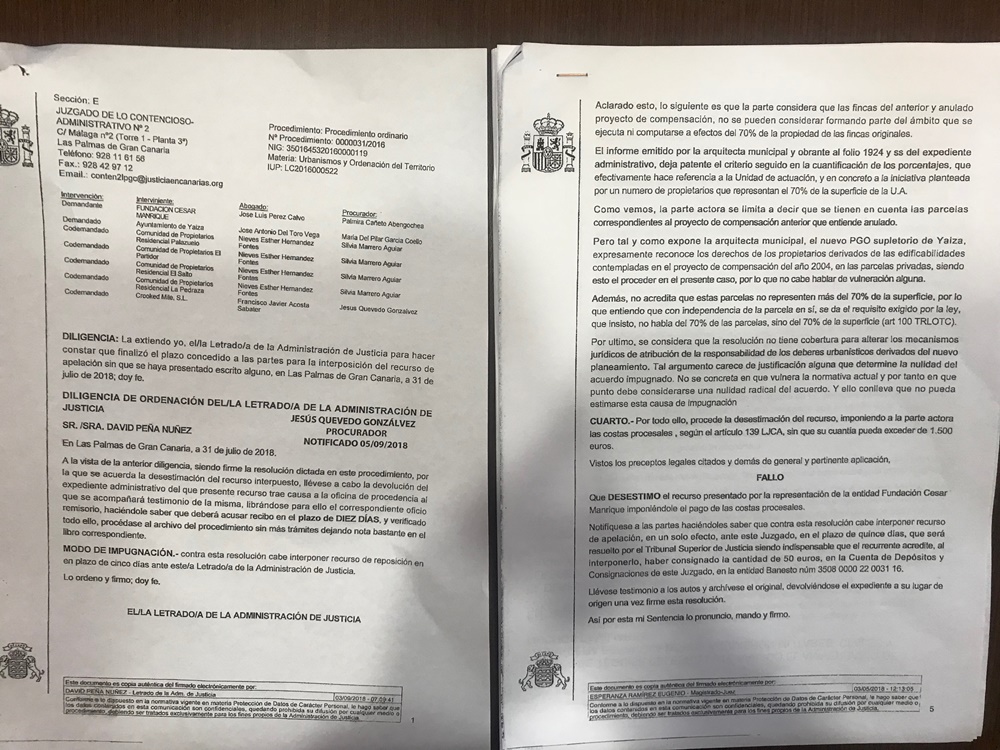 Lo cierto es que el Juzgado Nº 2 de lo Contencioso Administrativo de Las Palmas desechó uno por uno los argumentos de la FCM contra ese acuerdo adoptado por el Pleno de Yaiza que de facto legalizaba el Plan Parcial Playa Blanca desestimando en su fallo el recurso de la Fundación César Manrique e imponiéndole el pago de las costas procesales.