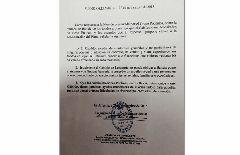Vea el informe de la jurista sobre la iniciativa en la que se pedía que el Cabildo retirara los fondos de Bankia si no concede un alquiler social a la portavoz de la PAH
