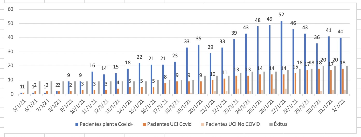 En cuanto a la gráfica relativa a los ingresos por covid en el Molina Orosa, se puede ver como se ha pasado de tener 11 pacientes en planta el 5 de enero a contar con 18 pacientes en la UCI y 40 en planta este 1 de febrero.