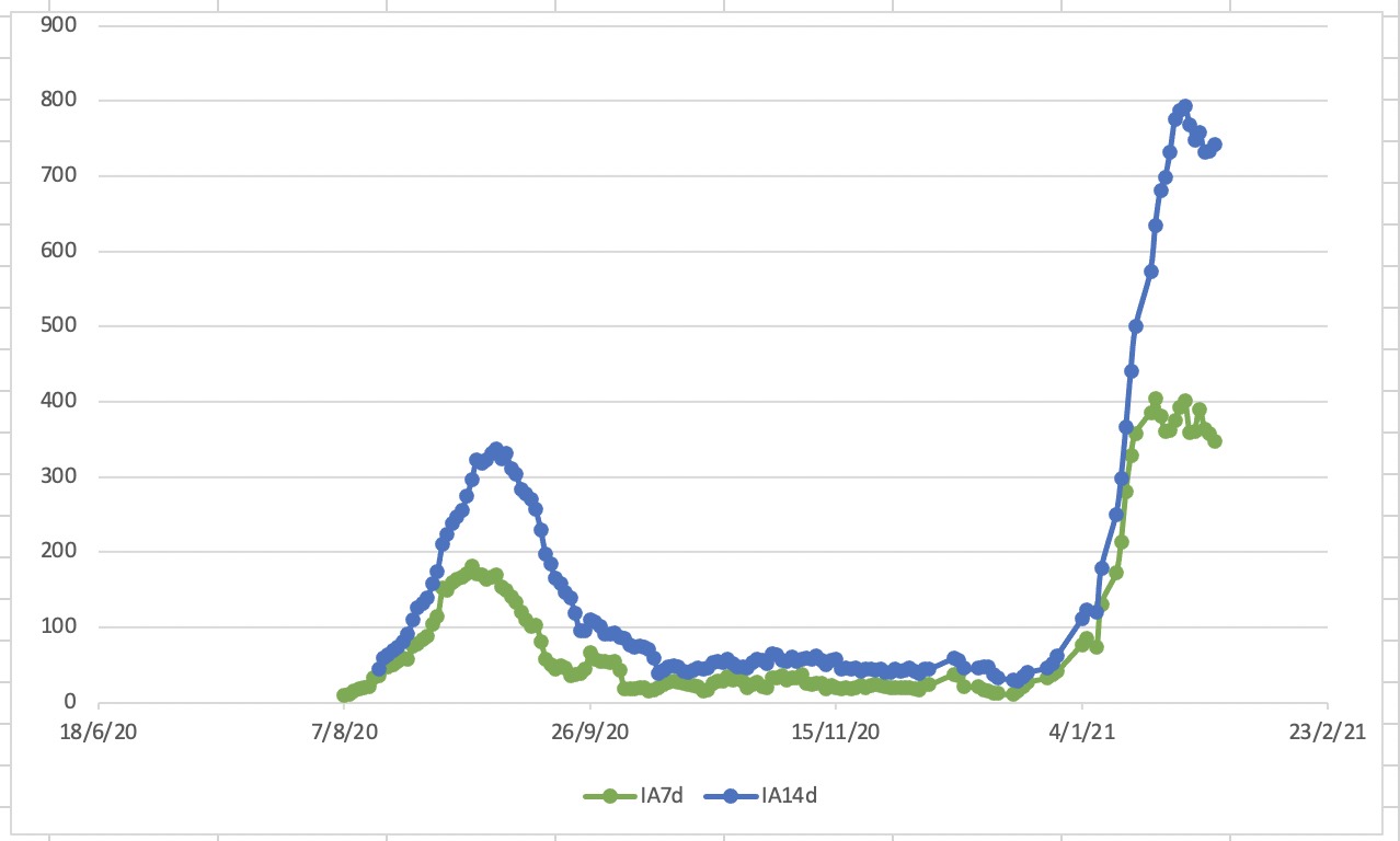 En el momento actual se sitúa en 348 casos por cada 100.000 habitantes a los siete días y en 741’4 a los 14 días. En este gráfico se puede ver con claridad como ha ido disparándose el crecimiento precisamente a los 14 días, de manera mucho más relevante.