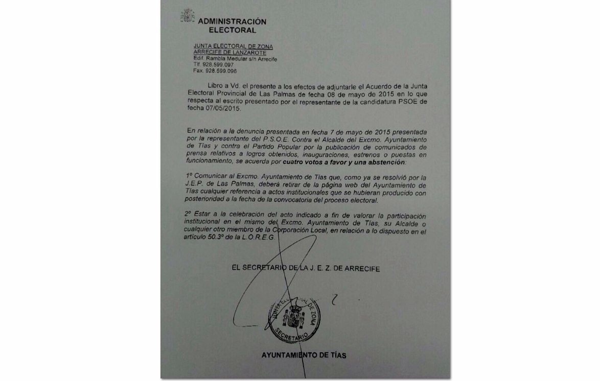 La Junta Electoral Provincial de Las Palmas ha estimado una denuncia del PSOE obligando al alcalde de Tías y candidato del PP, José francisco Hernández, a retirar de la web del Ayuntamiento de Tías "cualquier referencia a actos institucionales que se hubieran producido con posterioridad a la fecha de la convocatoria del proceso electoral".