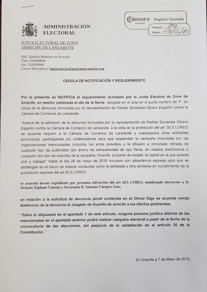 La Junta Electoral Provincial ha emitido una resolución donde suspende esa campaña informativa para mejorar Arrecife y donde se iba a exigir a los futuros gobernantes compromisos de mejoras de la ciudad.