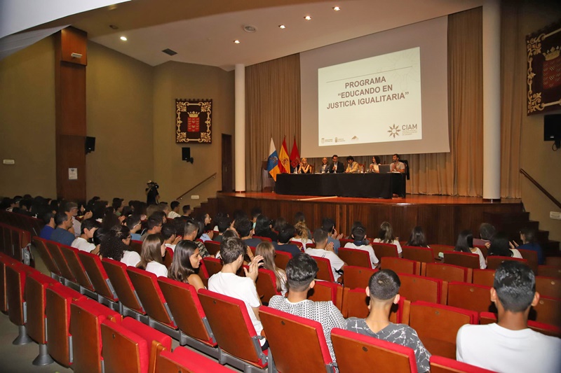 Más de un centenar de jóvenes de centros de educación secundaria de Lanzarote se reunieron en el salón de actos del Cabildo para asistir a la primera de un conjunto de charlas sobre justicia igualitaria, correspondiente a la aplicación del primer bloque del proyecto educativo "Educando en Justicia Igualitaria", impulsado por la Asociación de Mujeres Juezas de España (AMJE) y con la colaboración de la Consejería de Educación del Cabildo de Lanzarote.