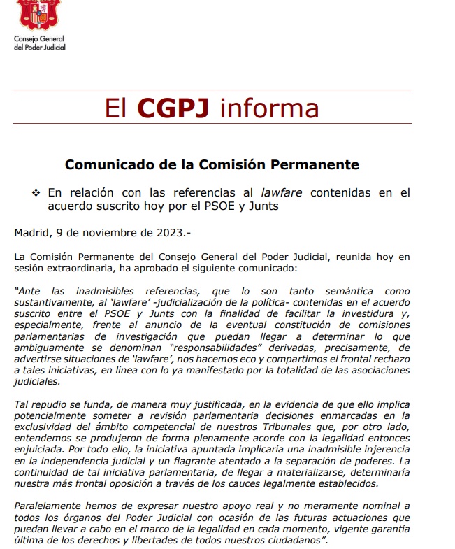 En este sentido, primero fue a Comisión Permanente del Consejo General del Poder Judicial, reunida el jueves en sesión extraordinaria, quién aprobó el siguiente comunicado: “Ante las inadmisibles referencias, que lo son tanto semántica como sustantivamente, al ‘lawfare’ -judicialización de la política- contenidas en el acuerdo suscrito entre el PSOE y Junts con la finalidad de facilitar la investidura y, especialmente, frente al anuncio de la eventual constitución de comisiones parlamentarias de investigación que puedan llegar a determinar lo que ambiguamente se denominan “responsabilidades” derivadas, precisamente, de advertirse situaciones de ‘lawfare’, nos hacemos eco y compartimos el frontal rechazo a tales iniciativas, en línea con lo ya manifestado por la totalidad de las asociaciones judiciales.