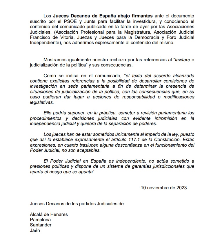 Esta mañana eran los Jueces Decanos de España quienes se manifestaban contra el documento suscrito por el PSOE y Junts para facilitar la investidura, señalando que “conociendo el contenido del comunicado publicado en la tarde de ayer por las Asociaciones Judiciales, (Asociación Profesional para la Magistratura, Asociación Judicial Francisco de Vitoria, Juezas y Jueces para la Democracia y Foro Judicial Independiente), nos adherimos expresamente al contenido del mismo.