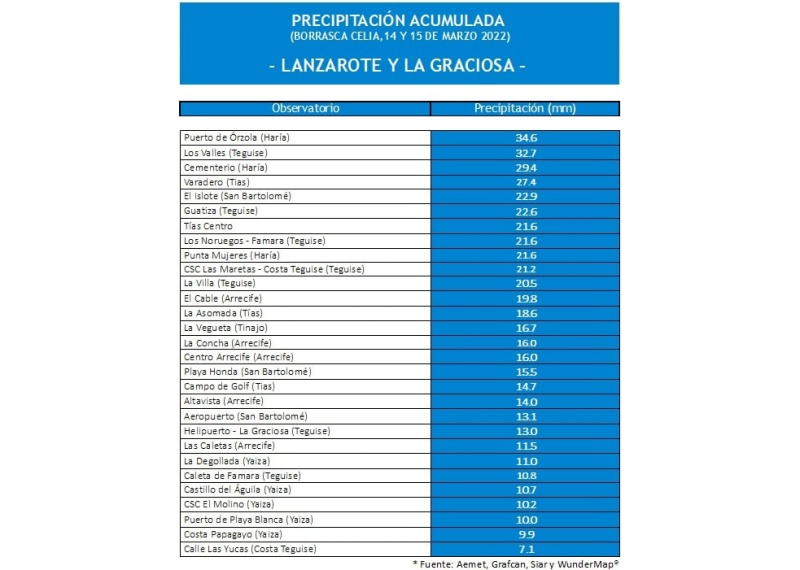 La precipitación acumulada hasta el momento, tal y como recoge la página Meteorología Lanzarote basándose en fuentes de la AEMET, Grafcan, Siar y WunderMap, ha dejado entre el 14 y 15 de marzo 34’ 6 litros en el Puerto de Órzola (Haría); 32’7 en Los Valles; 29’4 en el Cementerio de Haría; 27’4 en el Varadero de Tías; 22’9 en El Islote, en San Bartolome; 22’6 en Guatiza; 21’6 en el Centro de Tías, 21’6 también en Los Noruegos, en Famara y exactamente la misma cantidad en Punta Mujeres; 21’2 en el CSC Las Maretas en Costa Teguise; 20’5 en La Villa de Teguise; 19’8 litros en El Cable; 18’6 en La Asomada; 16’ 7 en La Vegueta; 16 en La Concha; 16 litros también en el centro de Arrecife; 15’5 litros en Playa Honda; 14’7 litros en el Campo de Golf de Tías, 14 litros en el capitalino barrio de Altavista; 13’1 en el Aeropuerto; 13 en el Helipuerto ubicado en La Graciosa; 11’5 en Las Caletas; 11 litros de La Degollada; 10’8 litros en Caleta de Famara; 10’7 litros en el Castillo del Águila de Yaiza; 10’2 litros en el CSC El Molino de Yaiza; 10 litros en el Puerto de Playa Blanca; 9’9 en Costa Papagayo y, finalmente, 7’1 litros en la zona de la calle Las Yucas de Costa Teguise.