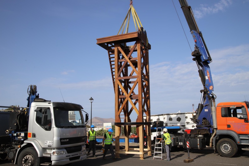 El consejero de Obras Públicas, Jacobo Medina y el alcalde de Teguise, Oswaldo Betancort, han supervisado esta mañana la instalación de la estructura de la Molina de Teguise en la plaza de La Mareta, cuyos trabajos de rehabilitación y restauración siguen en proceso dentro de los plazos establecidos.