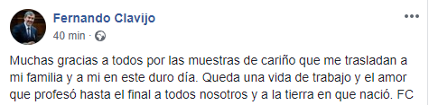 El propio Clavijo ha lanzado un mensaje en su página de Facebook. "Muchas gracias a todos por las muestras de cariño que me trasladan a mi familia y a mi en este duro día. Queda una vida de trabajo y el amor que profesó hasta el final a todos nosotros y a la tierra en que nació. FC"