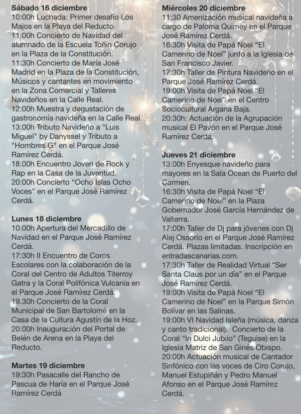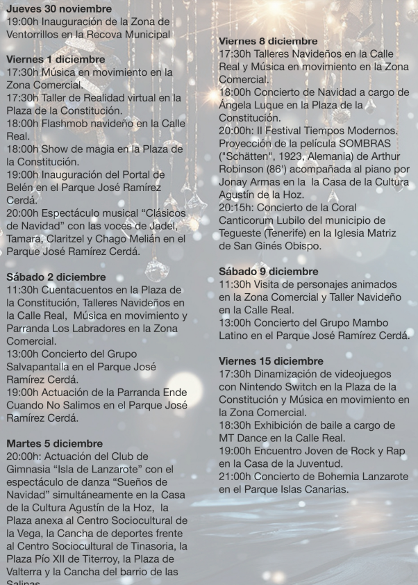 Tras la inauguración del Portal de Belén, todo el que lo desee podrá disfrutar del espectáculo musical "Clásicos de Navidad" con las voces de Jadel, Tamara, Claritzel y Chago Melián en el Parque José Ramírez Cerdá. Será a partir de las 20:00 horas.