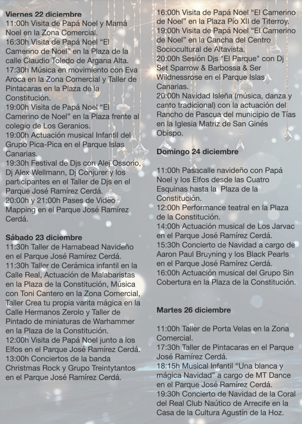 Previamente, a las 17:30 horas, habrá Música en movimiento en la zona comercial, y taller de realidad virtual en la Plaza de la Constitución y a las 18:00 horas, Flashmob navideño en la calle Real y show de magia en la Plaza de la Constitución.