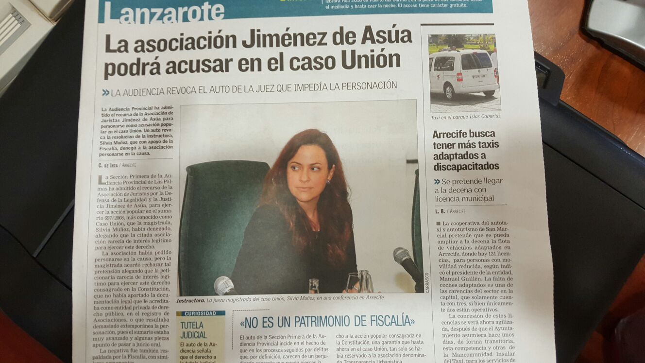 La Asociación de Juristas por la Legalidad y la Justicia, Jiménez de Asúa, podrá finalmente personarse como acusación popular en el Caso Unión, así lo ha aprobado la Audiencia Provincial admitiendo a trámite el recurso interpuesto por esta organización, tal como se dio a conocer en el periodico Canarias 7.