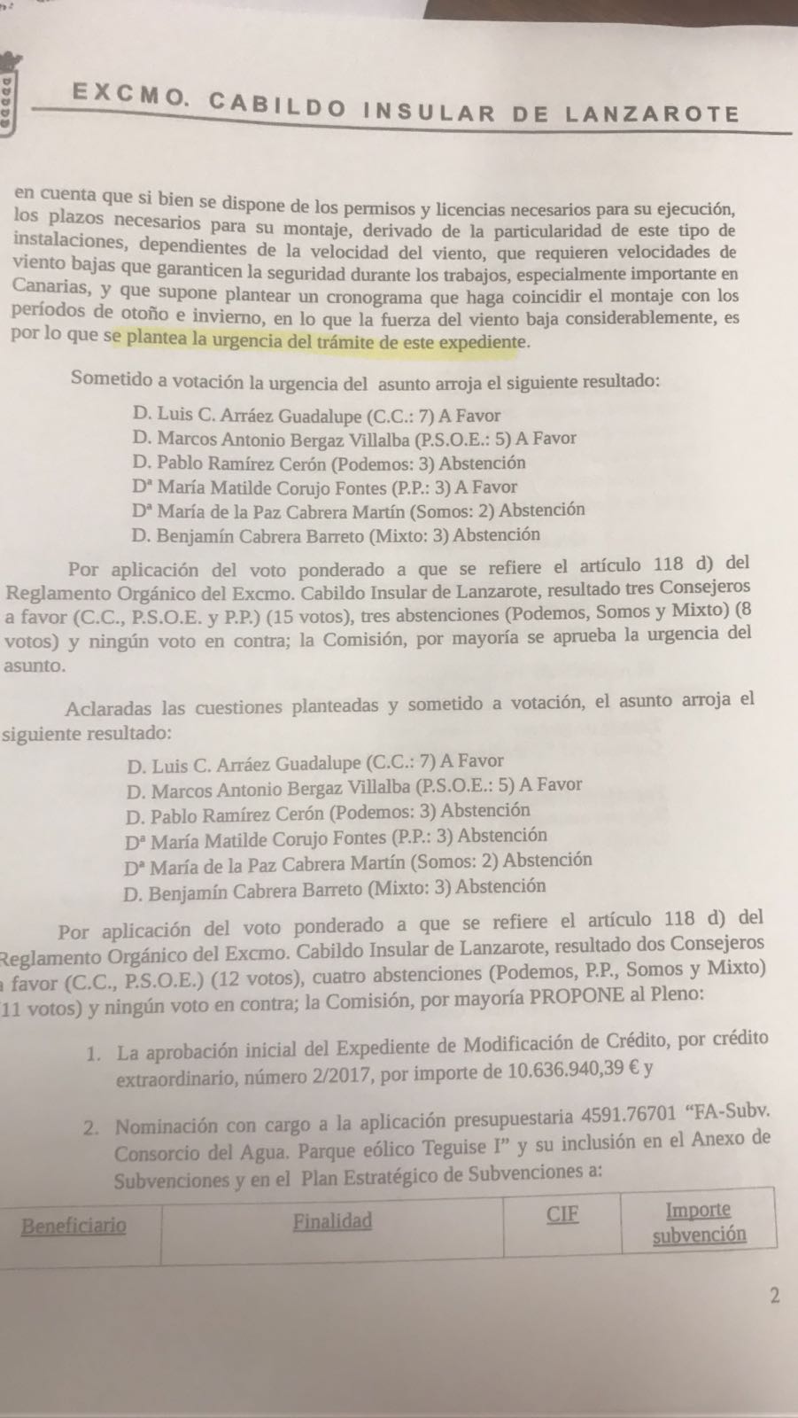Curiosamente, en esta ocasión el PSOE se abstuvo a un acuerdo que ellos mismos votaron a favor en la primera fase de inversión, y que ahora para la segunda parte del pago de los 6 millones se abstienen, dejando el asunto sobre la mesa, comentando dudas sobre la financiación, a pesar de que existe un informe favorable de fiscalización de inversión de la Intervención del Cabildo.