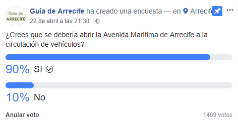 Los lanzaroteños piden que se abra la avenida de la ciudad en la encuesta realizada por la página de Facebook "Guía de Arrecife" que ya cuenta con más de 1.400 votos. Un 90% de los participantes piden que se permita la circulación al tráfico, mientras que un 10% ven positivo este cierre.