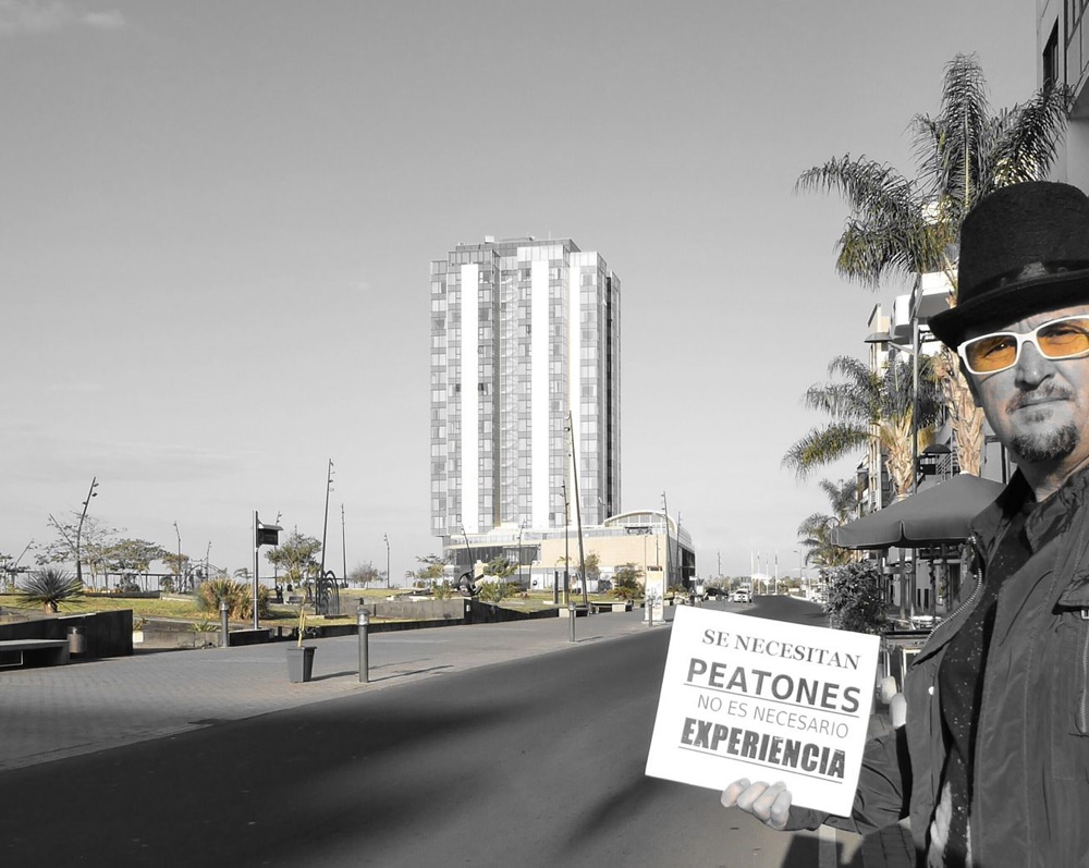 El popular Maxi Ferrer, conocido showman de Arrecife, quien fuera además pregonero del Carnaval, llenaba ayer lunes las redes sociales con esta curiosa imagen en la porta un cartel que dice que "se necesitan peatones, no es necesario experiencia", criticando lo vacío que se encuentra la avenida, a pesar que desde el grupo de gobierno capitalino se siga apostando por este modelo de vías.