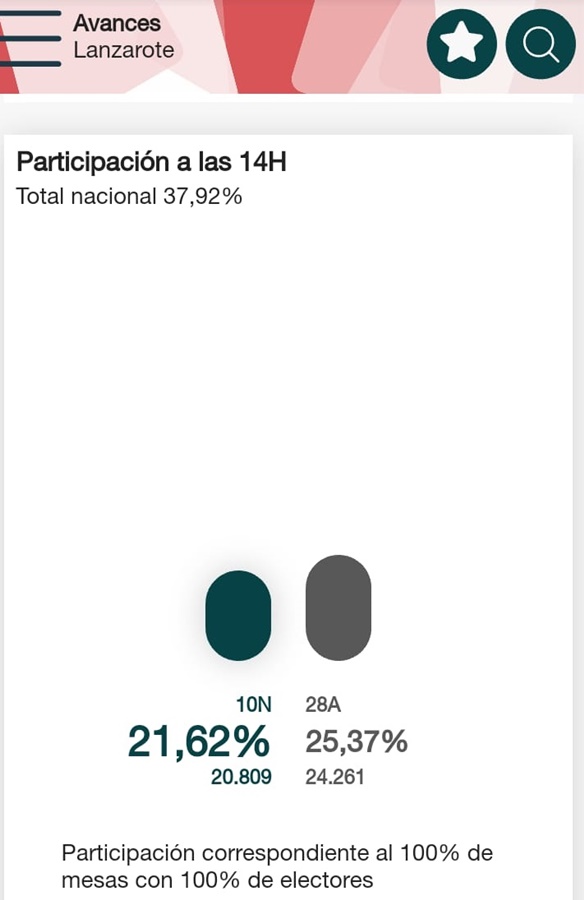 Así, a esta hora han acudido a ejercer su derecho al voto en Lanzarote un total de 20.809 personas, un 21,62% del censo electoral, frente a los 24.261 (25,37%) que fueron el 28A.
