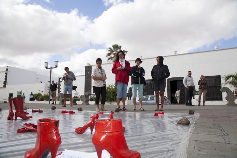 El alcalde de Teguise, Oswaldo Betancort, y la concejala de Igualdad, Nori Machín, en coordinación con el Foro Contra la Violencia de Género, conmemoró esta mañana el Día Internacional de la Eliminación de la Violencia Hacia la Mujer con el proyecto Zapatos Rojos, una instalación al aire libre en la que todos podían aportar unos zapatos rojo o pintarlos en señal de rechazo a la violencia de género, obra de la artista visual Elina Chauvet, dedicada a las mujeres que han sufrido violencia de género.