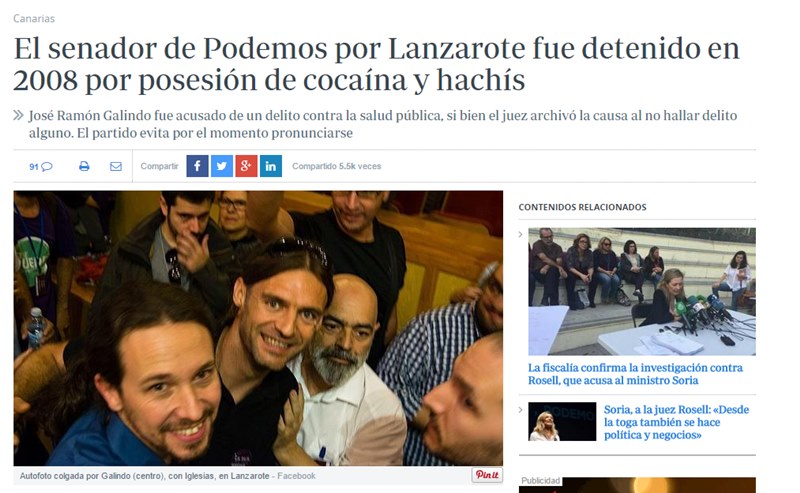 En la noticia, ABC recuerda que Galindo fue arrestado por la Policía Local de Tías confiscándosele "10 envoltorios de cocaína, un trozo de hachís y 120 euros fraccionados en billetes" y recoge las declaraciones hechas en La Provincia por el consejero de Podemos en el Cabildo, Carlos Meca, señalando su absoluta "tranquilidad", dado que el Juzgado archivó la denuncia y, según él, "ni siquiera llego a ser juzgado".