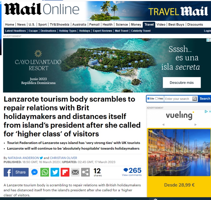 La prensa británica, concretamente el Dailymail, que fue el primero medio que publicó la polémica sobre las declaraciones de la presidenta del Cabildo, Dolores Corujo, en Fitur, en torno a la saturación turística de la isla, reconoce el esfuerzo que está haciendo la patronal turística para reparar las relaciones. Señalan, además, que “se ha distanciado de la presidenta de la isla después de que ella pidió una "clase más alta" de visitantes. La Federación de Turismo de Lanzarote (FTL) ha reiterado hoy que la isla tiene 'lazos muy fuertes' con los turistas británicos y seguirá siendo 'absolutamente hospitalaria' con ellos”.
