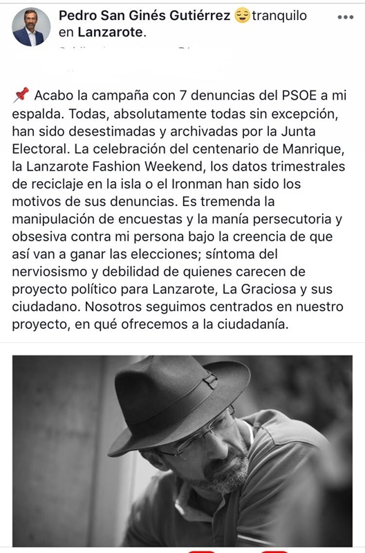 "Acabo la campaña con siete denuncias del PSOE a mis espaldas. Todas, absolutamente todas sin excepción, han sido desestimadas y archivadas por la Junta Electoral. La celebración del centenario de Manrique, la Lanzarote Fashion Weekend, los datos trimestrales de reciclaje en la isla o el Ironman han sido los motivos de sus denuncias", dice San Ginés.