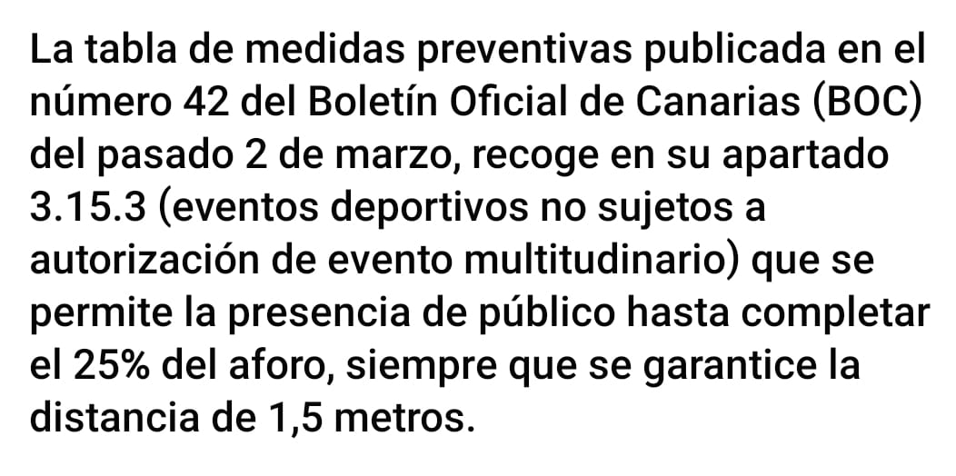 Incluso las medidas de al UD Lanzarote iban a ser más seguras que las que exige la propia Consejería de Sanidad del Gobierno de Canarias. Se iba a ampliar la distancia de seguridad de 1,5 metros a 3 metros y además no se iba ni tan siquiera a llegar al 25% del aforo. Que se podría.