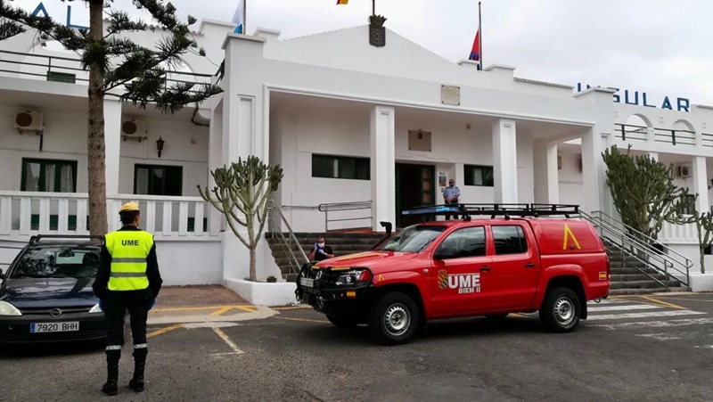 La Unidad Militar de Emergencias (UME) se encuentra hoy en Lanzarote para desarrollar labores de desinfección en casi una veintena de instalaciones. A las siete de las mañana llegaba a la isla, procedente de Gran Canaria, un destacamento integrado por 31 efectivos que trabajará intensamente durante toda la jornada en oficinas y sedes de distintos servicios.