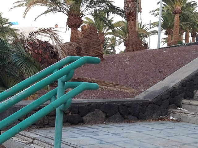 Lamentable estado de las palmeras del Parque de Los Pinos en Titerroy, Arrecife. Los vecinos de este barrio capitalino nos han hecho llegar las imágenes del abandono de los jardines del Parque de Los Pinos, quejándose del peligro e inseguridad que generan para los viandantes de esta zona capitalina.
