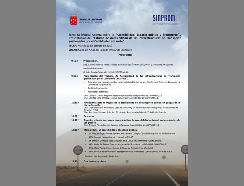 Durante el foro se darán a conocer los resultados del estudio encargado por la Corporación el pasado mes de marzo, a la Sociedad Insular para la Promoción de las Personas con Discapacidad S.L. (SINPROM), sobre la accesibilidad de las infraestructuras de transporte público adscritas al Cabildo de Lanzarote.