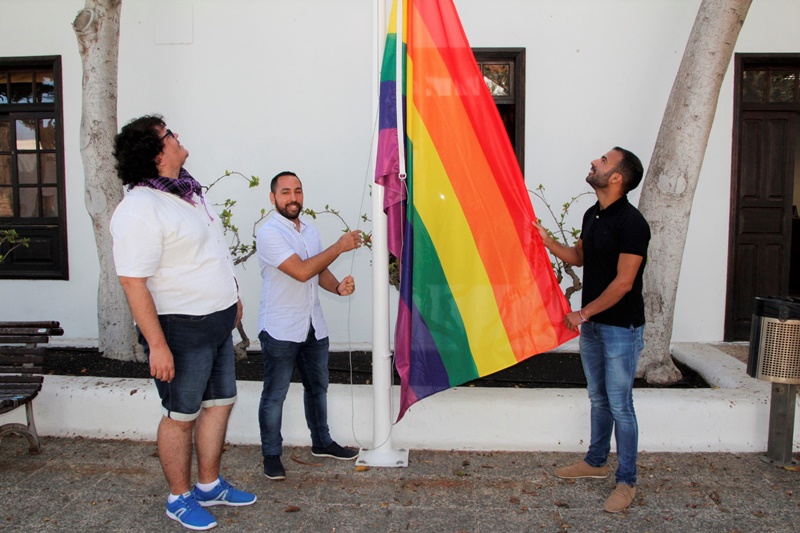 Daniel Medina, y el colectivo Lánzate LGTBI + de Canarias, representado por su presidente, Josué Duarte, y el secretario, Rayco Betancort, izaron este miércoles la bandera arcoíris en la fachada del Ayuntamiento de Yaiza. Lánzate, que agradece el apoyo de Yaiza, admite que España es un referente en materia legal, "pero queda aún mucho camino por recorrer porque todavía tenemos que soportar la homofobia y, sin duda, las leyes han avanzado más que la sociedad", puntualiza Josué Duarte.