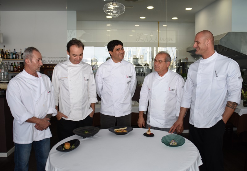 Germán Blanco, Pedro Santana, Luis León, Orlando Ortega y Juan Jesús Perdomo han sido los encargados de presentar sus creaciones al púbico en Marina Lanzarote como adelanto gastronónomico a lo que se podrá degustar este fin de semana en La Villa de Teguise bajo el sello de calidad Saborea Lanzarote.