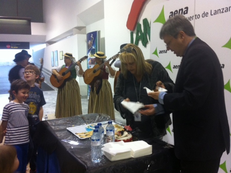 El consejero delegado de la Sociedad de Promoción Exterior de Lanzarote, Héctor Fernández, y el director del aeropuerto, Manuel Vinagre, fueron los responsables de dar la bienvenida a los 189 pasajeros del vuelo en la sala de equipajes de la T1. Mientras degustaban una porción de la tradicional tarta de bienvenida que ofrecen los responsables del recinto aeroportuario, la parranda El Requinto hacía sonar algunos de los ritmos más identificativos del patrimonio musical insular.