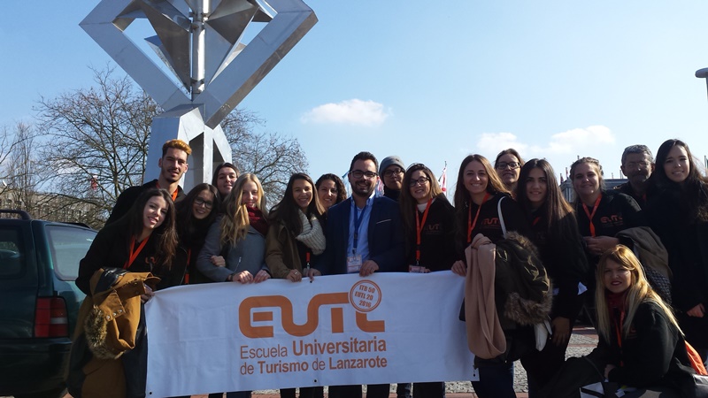 Clavijo y Eugenio saludaron al grupo de alumnos de la Escuela Universitaria de Turismo de Lanzarote que participan en una iniciativa que cumple ya 20 ediciones. Desplazados a la feria en un viaje coorganizado por el centro educativo, los propios alumnos y Turismo Lanzarote, están “conociendo en primera persona” el funcionamiento interno de un evento de esta magnitud en lo que constituye una experiencia profesional excepcional. Ellos colaborarán ofreciendo información en el propio stand de Lanzarote como parte de su proceso formativo. Los alumnos tuvieron la oportunidad, además, de inmortalizarse delante del Juguete del Viento que preside la entrada del recinto Messe.