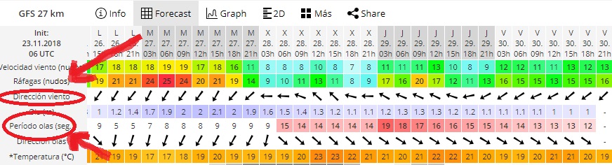 Además es importante tener en cuenta el periodo de tiempo de olas. Quizá en este baremo el mejor día sería el jueves a primera hora.