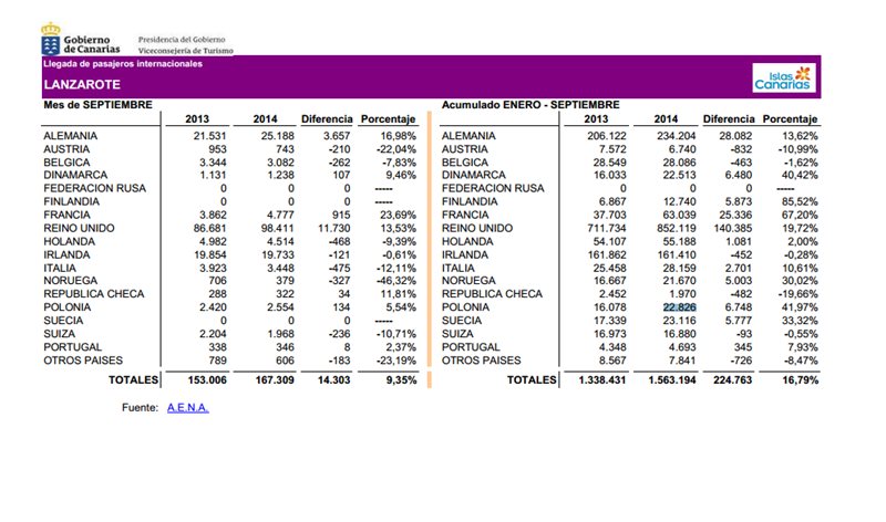 Lanzarote es la isla de Canarias que más ha crecido en la llegada de turistas extranjeros en lo que va de año, según datos aportados por Aena. En concreto, de enero a septiembre de este 2014 ha recibido la llegada de 1.563.194 pasajeros extranjeros, un 16,79% más, es decir, 224.763 turistas foráneos más que en el mismo período de 2013.En septiembre, fueron 167.309 los pasajeros extranjeros que visitaron la isla, 14.303 pasajeros más que el mismo mes del año pasado.