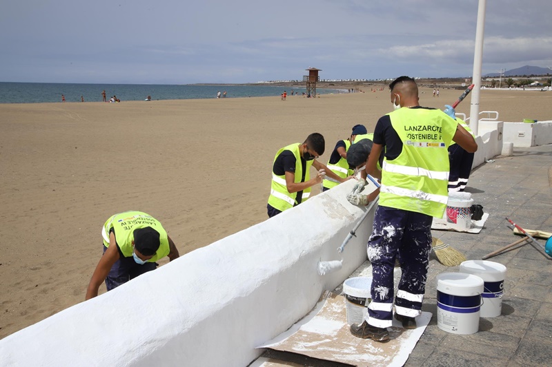 Estos trabajos comenzaron antes del estado de alarma en el municipio de Arrecife y actualmente se han retomado en la localidad de Playa Honda donde las obras se han centrado en el repintado de los muros y mobiliario urbano, reparación de alcornoques y poda de las palmeras de la Avenida, un lugar bastante transitado diariamente por cientos de personas. En estos momentos están trabajando en este proyecto un total de 65 personas, 44 peones mas 12 responsables en los cuatro grupos de trabajo (coordinador de grupo, capataz, monitor medioambiental por cada eje) mas dos personas del equipo psicosocial, cinco docentes, un administrativo y una coordinadora.