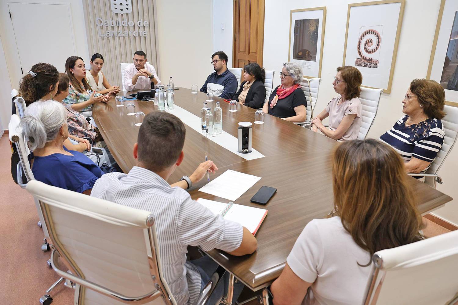 El presidente del Cabildo de Lanzarote, Oswaldo Betancort, y la consejera insular de Artesanía, Aroa Revelo, han mantenido esta semana una reunión de trabajo con varias de las mujeres artesanas que mantienen viva en la isla la tradición del trenzado de la Roseta, una de las expresiones más representativas del arte textil tradicional canario.