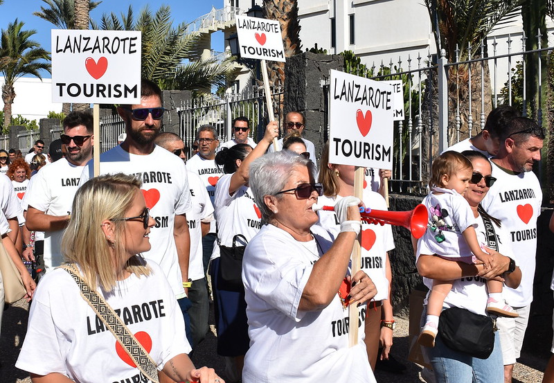 Los manifestantes, que en su mayoría llevaban camisetas blancas con el lema “Lanzarote loves Tourism”, realizaron el mismo recorrido que en la movilización de la mañana, desde las inmediaciones del Hotel San Antonio hasta el Hotel Fariones. En su recorrido muchos turistas que disfrutaban de los establecimientos de restauración que jalonan toda la Avenida los animaban y aplaudían.