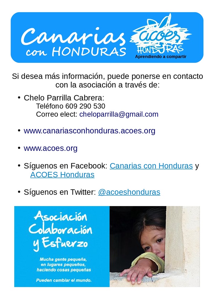El padre Patricio y todo los miembros de la ONG ACOES Canarias con Honduras agradecen la disposición y voluntariedad de los colegios Nieves Toledo de Arrecife y el CEIP Costa Teguise que han realizado varias acciones para colaborar con los niños y niñas hondureños.