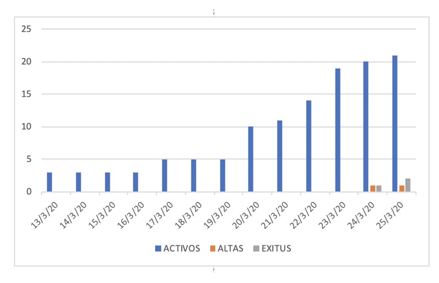 De los 24 casos de COVID-19 que a día de ayer había en la isla, 10 de ellos están ingresados en planta, mientras que los tres restantes se encuentran en la UCI. Además, ha habido dos fallecimientos y un alta hospitalaria. Un total de 11 contagiados están siendo tratados en sus domicilios. Eso significa que a día de hoy en la isla hay 21 casos activos de coronavirius.
