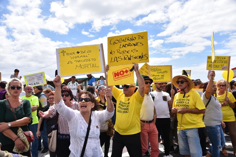 Bajo el lema 'Que no te roben la pensión', cerca de un millar de personas secundaron en Arrecife la convocatoria organizada por los sindicatos y las distintas plataformas ciudadanas. Entre los manifestantes decenas de jubilados y pensionistas que en sus pancartas exigieron el cumplimiento de sus derechos, recordando al Gobierno el disgusto que sienten por la escasa y casi ridícula subida de las pensiones, que crecen desde el 2011 un 0,25% anual, según el decreto establecido por el gobierno.