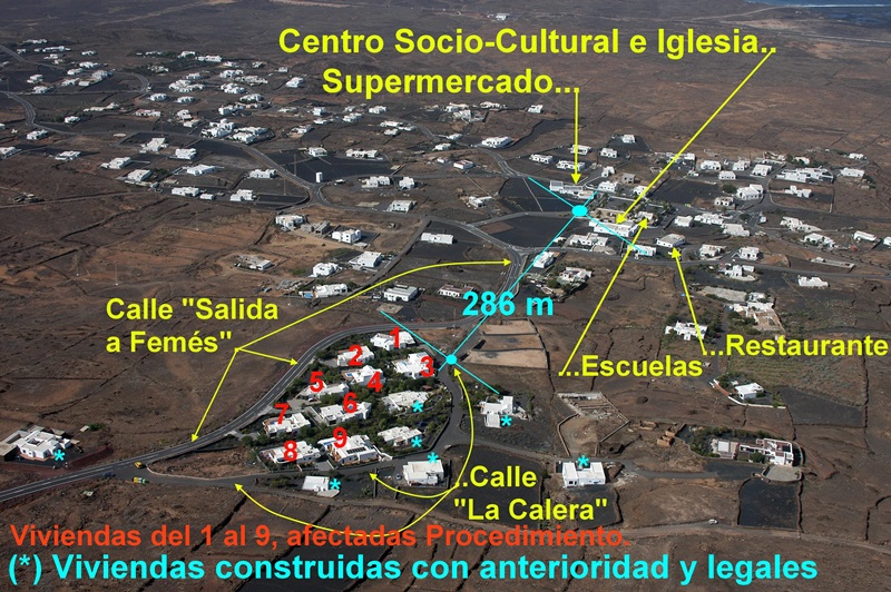 Desde Lancelot Digital, nos hacemos eco de esta fotografía que se aportó en el juicio para que los ciudadanos comprueben que alrededor de esas viviendas denunciadas se habían construido otras anterioridad, tal y como se señala en asteriscos azules.