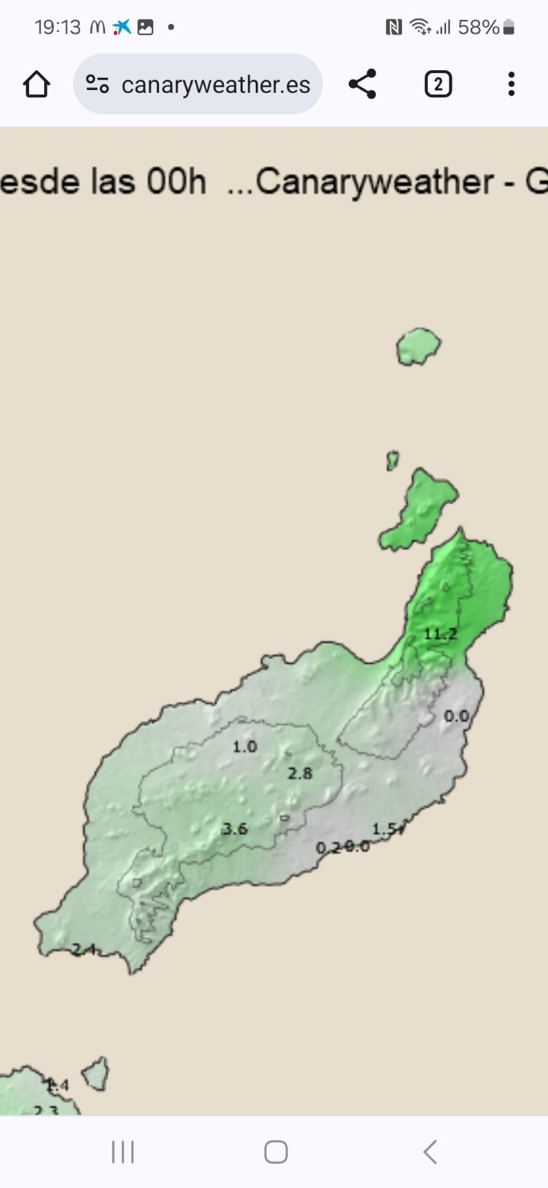 El mapa de pluviales facilitado por los Servicios de Emergencia de Lanzarote en la tarde del domingo apuntan a que la zona norte de la isla, con más de 11 litros por metro cuadrado a la hora, es la que más ha sentido los efectos de esta depresión meteorológica durante el domingo.