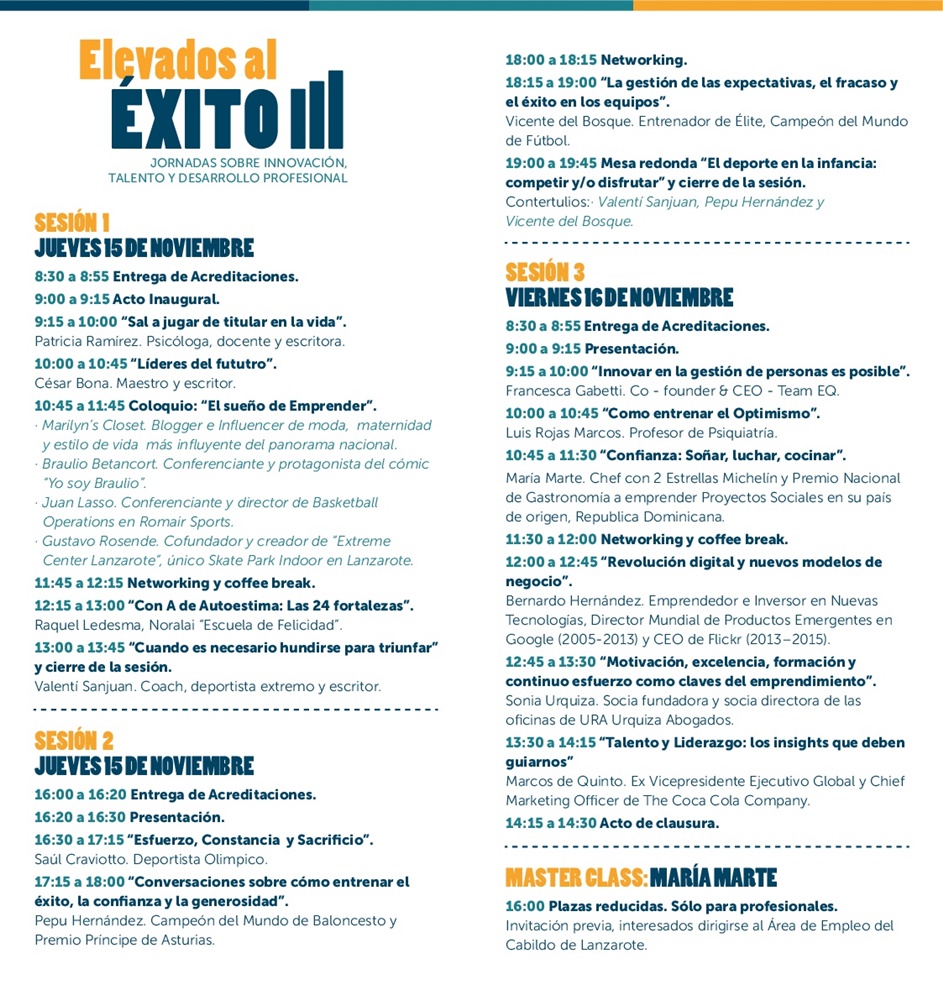 Concretamente tendrán como ponentes a Vicente del Bosque, Luis Rojas Marcos, César Bona, Pepu Hernández, Saúl Craviotto, Marylin's Closet, Raquel Ledesma, Valentí San Juan, Patricia Ramírez, Marcos de Quinto, María Marte, Bernardo Hernández, Sonia Urquiza, Gustavo Rosende, Francesca Gabetti, Braulio Betancort y Juan Lasso.