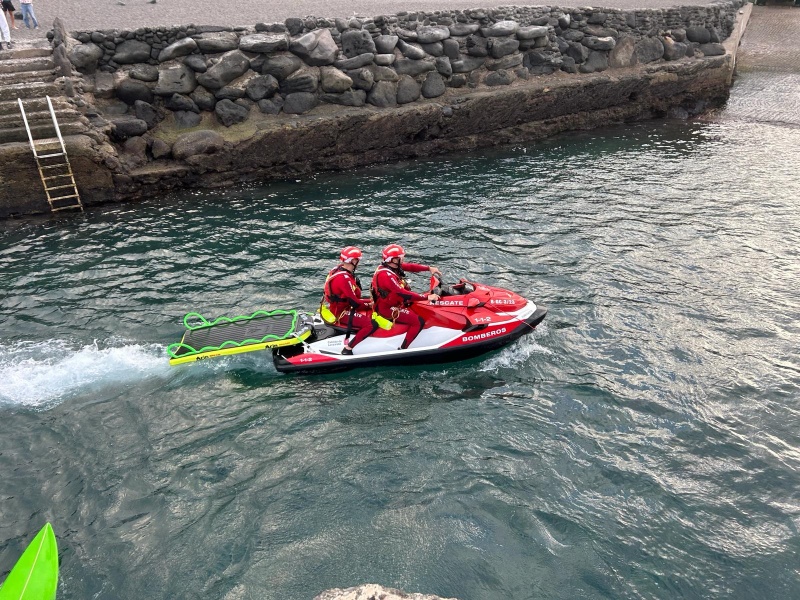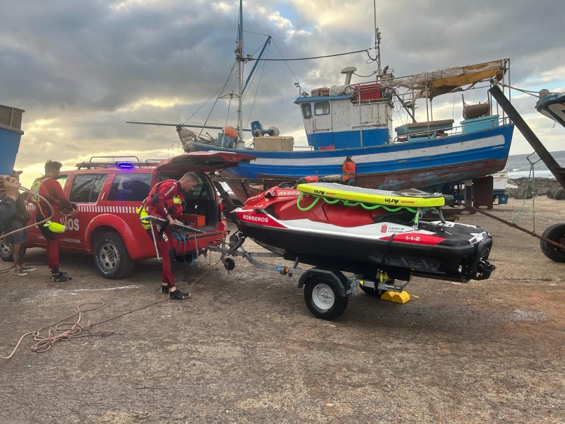 Salieron en su ayuda en moto de agua y lo divisaron a 400 metros de la costa. Se encontraba en buen estado y fue trasladado al puerto de La Santa en la table de rescate de la moto.