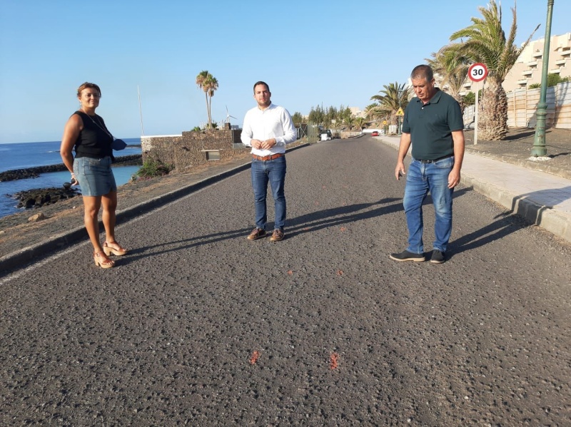 El consejero y la edil, acompañados del responsable de Vías y Obras de Teguise, Eugenio Robayna, visitaron este viernes, la zona donde se ha comenzado a marcar las líneas rojas que definen el trayecto del carril bici, cuyas obras se prevé que arranquen en unas semanas.