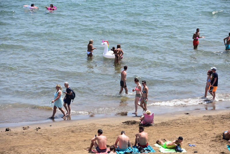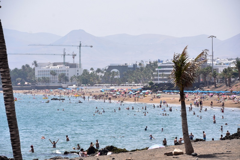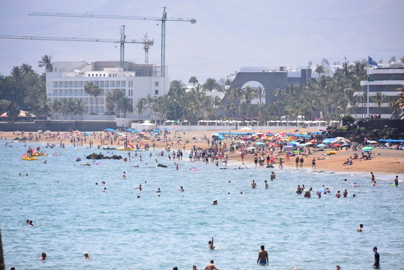 El calor y las vacaciones abarrotan los arenales de turistas y lanzaroteños