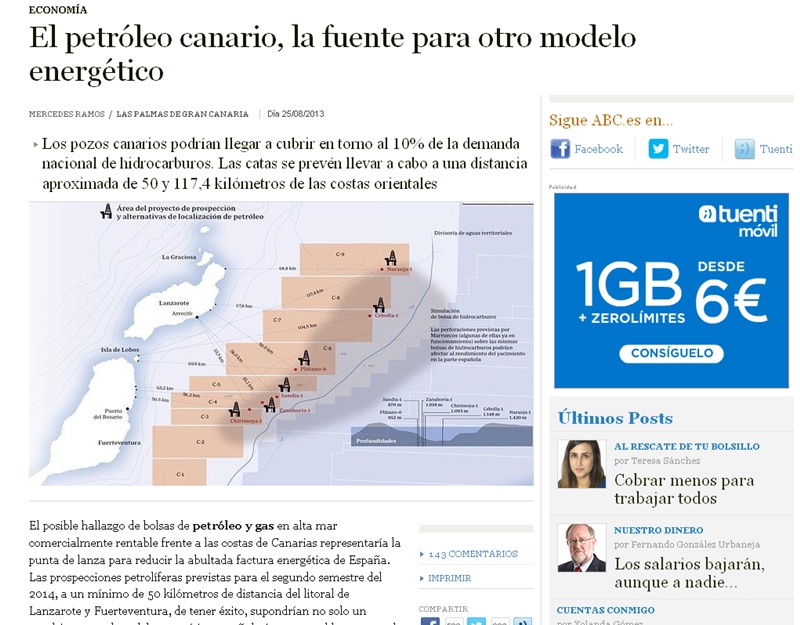 Éste es uno de los datos más relevantes de esta información, en la que se añade que “el posible hallazgo de bolsas de petróleo y gas en alta mar comercialmente rentable frente a las costas de Canarias representaría la punta de lanza para reducir la abultada factura energética de España”.