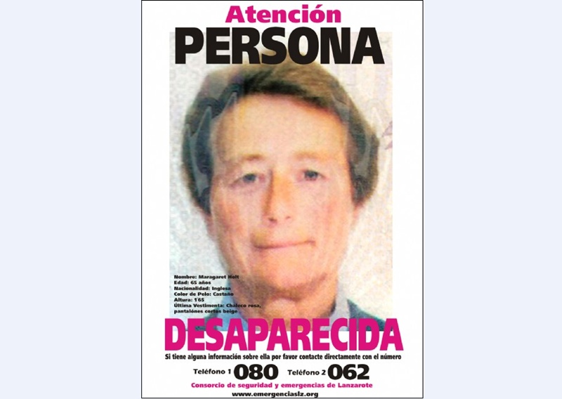 Margaret Holt fue vista por última el pasado 23 de diciembre de 2011 mientras hacía senderismo en las inmediaciones del Volcán de la Corona. Tenía el pelo de color castaño, medía 1,65 metros de altura y era de complexión delgada. En el momento de su desaparición, vestía una camiseta rosa, pantalones cortos, tipo bermuda, de color marrón claro, unas sandalias blancas y llevaba una mochila pequeña de color negro.